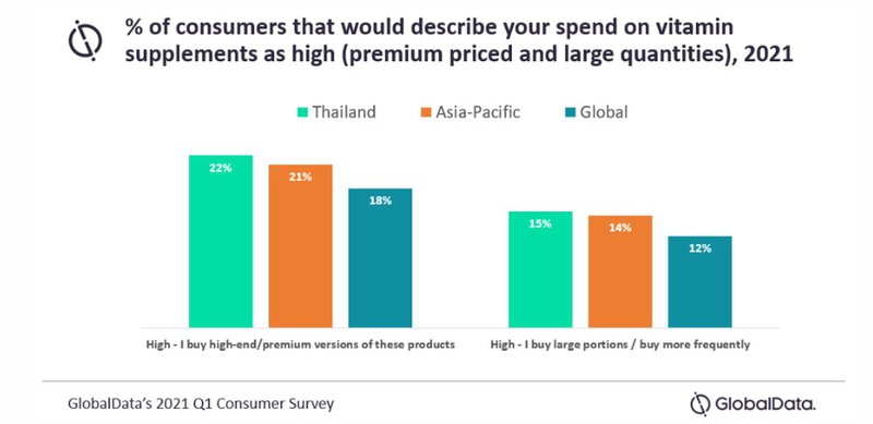 ⚡Immunity-boosting became important during the pandemic and continues to have a strong presence. Vitamin-infused functional drinks have seen significant growth in the market. According to GlobalData’s 2021 Q1 survey, Thai consumers said they buy high-end or premium vitamin supplements and prefer large portions of them versus APAC and Global consumers.